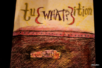 when i was thinking about the word inequality, i asked myself 'what is inequality?' and often when i am focusing on a word or a name, i see it spelled out in my mind's eye. 'intuition' kept popping into my little headball. isn't that weird? so i sat down with the kids colors and just kept going until the entire page was covered. i didn't even really want to write the equal[what]ity. it made me uncomfortable. maybe it is the concept, or what it means in society. because it conflicts with the thought that everything is meant to be. this idea is rather often rolling around in my thoughts. do you know what i think? if we look at our life's timeline of events as a map, there are certain cities that we will hit. however, we will get there on the path that we forge for ourselves. so maybe we are humbled and listening with an obedient ear to the direction, or maybe we are jamming cotton in our ears because we need to climb up a treacherous cliff and skid down a steep hill, and then walk through a dusty, sun-bleached field, and then jump puddles in a rainstorm and then walk over coals before we can get to the next city. we are reminded to be faithful in the face of trial, and through the trials find faith. so whether by devotion or by lesson, we reach the same point. whether we have worked 12 hours or 1 hour, we will receive the same reward. perhaps the inequality then sits between the faithful and whatever is left.